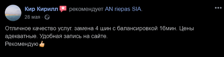 Персональные данные клиента доступны работникам SIA "AN Riepu centrs". Персональные данные клиентов не будут передаваться третьим лицам. SIA "AN Riepu centrs" может передать персональную информацию клиентов только в следующих случаях: